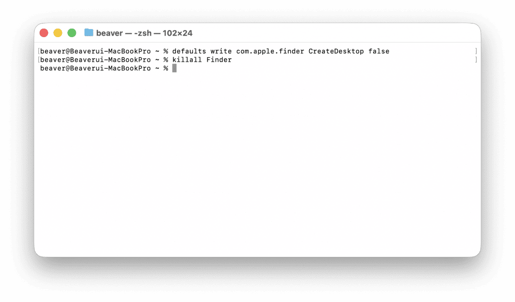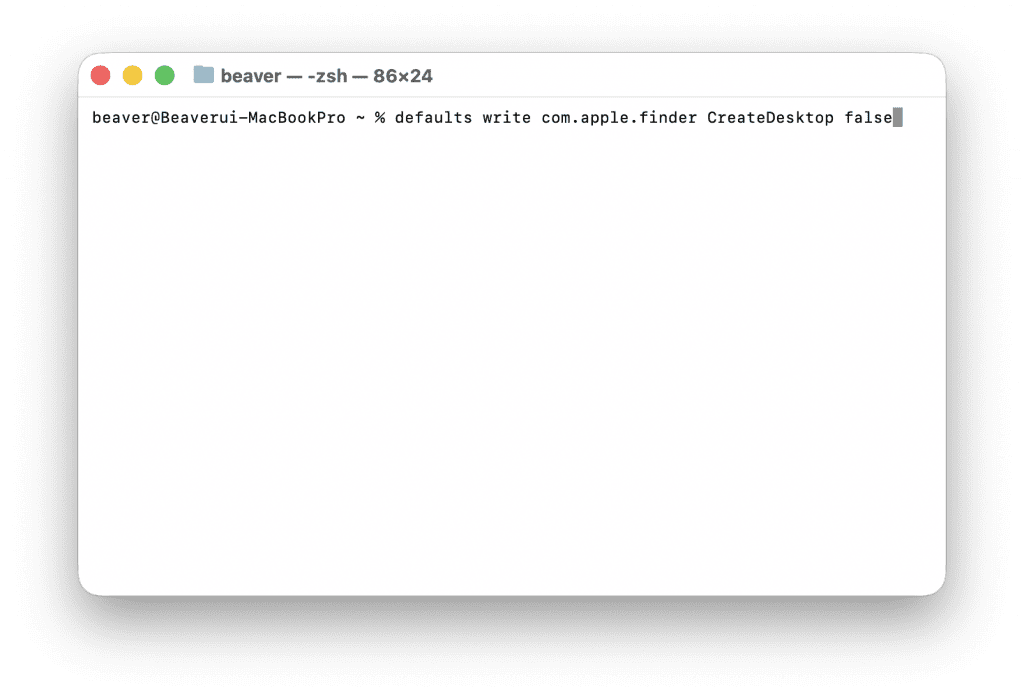 1-2-1. “defaults write com.apple.finder CreateDesktop false” 입력 후 Enter키를 눌러주세요.