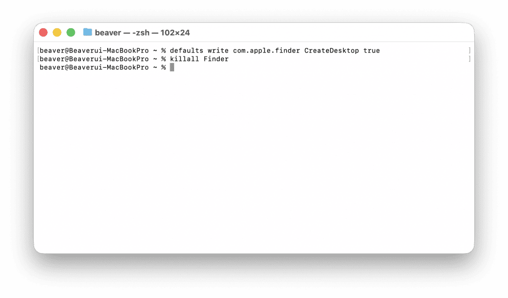 2-2-1. “defaults write com.apple.finder CreateDesktop true” 입력 후 Enter키 눌러주세요.