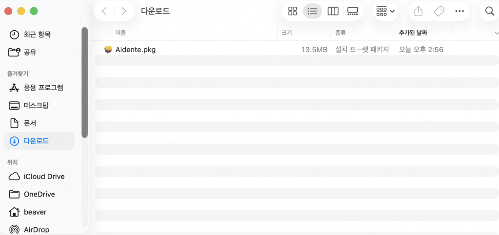 위 화면과같이 “Aldente.pkg”파일이 설치되신것을 볼 수 있으실거에요! 이 파일을 실행시켜주세요!
