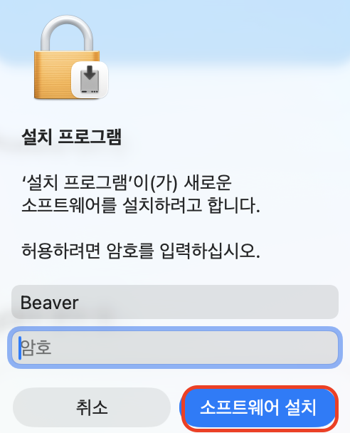 설치 하다보면 위와 같이 맥북 비밀번호를 요구하는 창이 나올꺼에요! 맥북 비밀번호를 입력하시고 “소프트웨어 설치” 버튼을 눌러주세요.