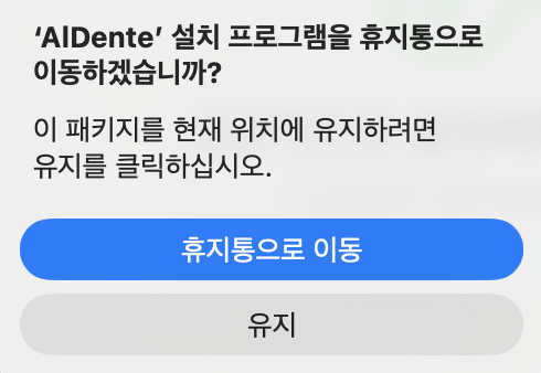“닫기”누르면 위와같은 창이 나오실거에요! aldente 설치 패키지를 추후에도 이용하실 것 같다면 “유지”를 눌러주시고 아니라면 “휴지통으로 이동” 눌러주시면 되세요. “휴지통으로 이동” 눌러도 이미 “aldente”설치는 완료된상태라 걱정말고 지워주셔도 되세요!