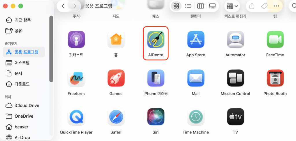 Finder-응용프로그램에 가보시면 위와 같이 “AlDente”가 잘 설치되신것을 볼 수 있으실거에요! 이를 실행해주세요.