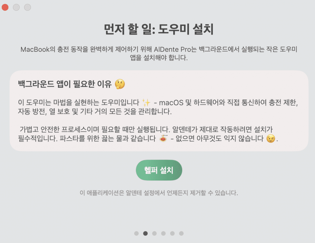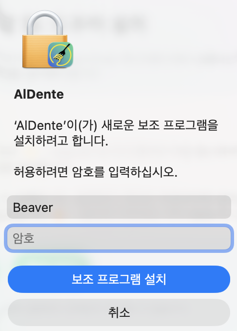 헬퍼 설치 누르면 위와 같이 맥북 비밀번호 요구창이 뜹니다. 비밀번호 입력해주시고 “보조 프로그램 설치” 버튼 눌러주세요.