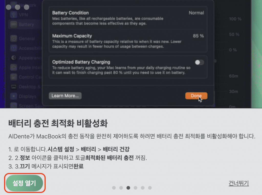 맥북 배터리 관리의 정석이라고 불리는 “AlDente” 입니다.