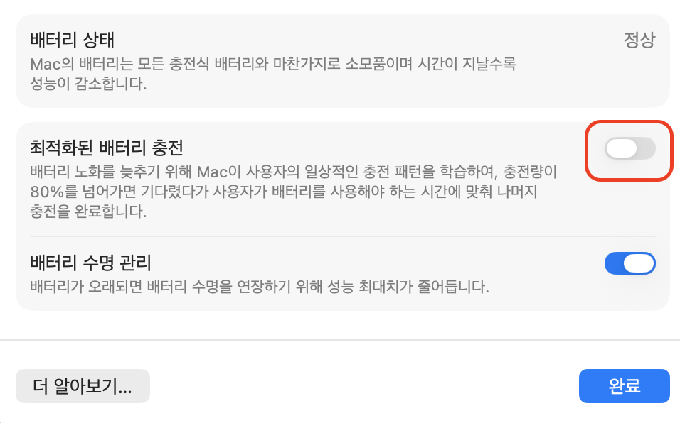 “배터리 건강” 또는 “배터리 성능상태” 대한 부분이 보이신다면 “정보” 아이콘(“i” 아이콘) 클릭하고 “최적화된 배터리 배터리 충전”을 꺼주세요!(기본적으로 파란색으로 표시되고 스위치가 오른쪽으로 가있는 상태(켜져있는상태)입니다)