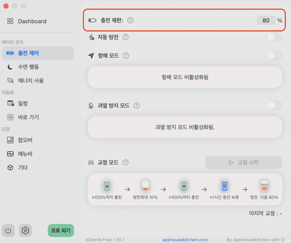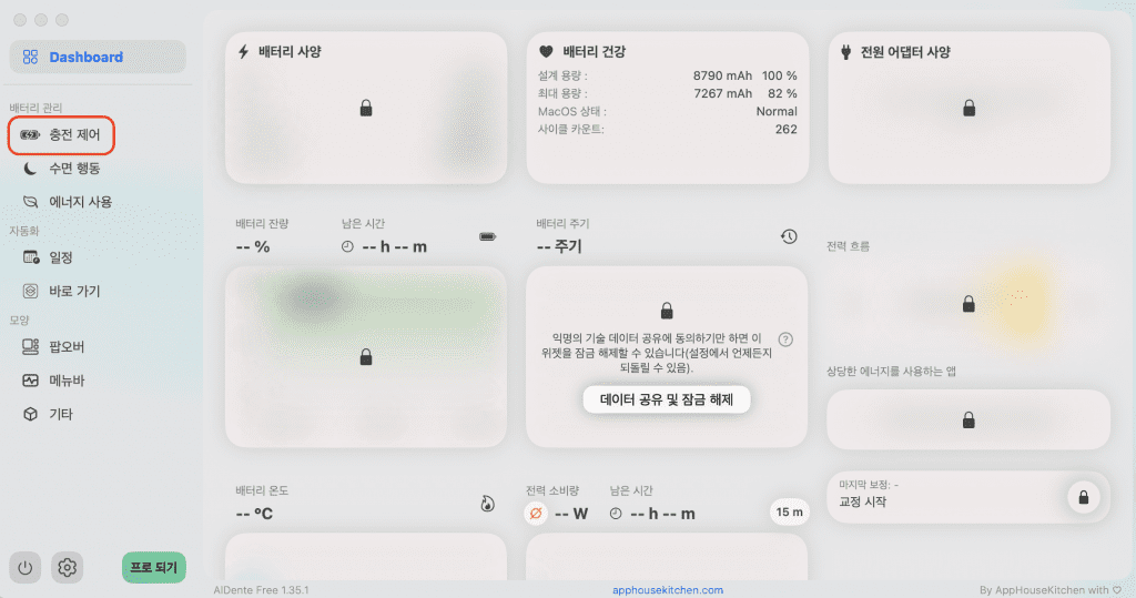 이외 배터리 관련된 대부분의 기능들은 아쉽게도 유료버전(Aldente Pro)에서만 이용가능하십니다!