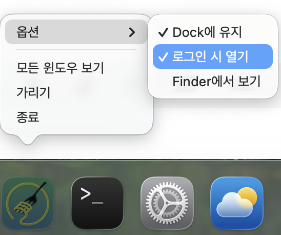 하지만 매번 Aldente 찾아서 켜주는 것도 번거롭잖아요? 그러니 위와 같이 맥북화면 하단의 Dock바에있는 Aldente 우클릭 > 옵션 > “로그인 시 열기”를 클릭해 체크된 상태로 설정해놓으시면 맥북 종료 또는 재부팅후에도 자동으로 Aldente가 켜지고 이로써 배터리 충전량제한기능도 자동으로 적용되니 훨씬 편하겠죠!