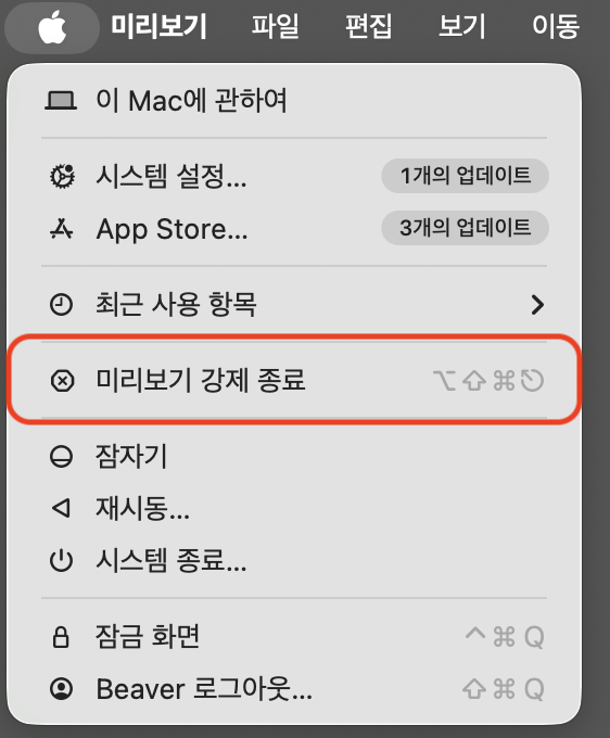 (참고로 저는 “미리보기”라는 프로그램을 켜둔 상태라서 “강제종료”버튼이 아닌 “미리보기 강제 종료”버튼으로 나오는거에요! 만약 저처럼 “강제 종료”가 아닌 “(실행중인 프로그램명) 강제 종료”라고 나오신다면 이 버튼을 누를시 실행중인 프로그램만 강제종료 되실거에요! )