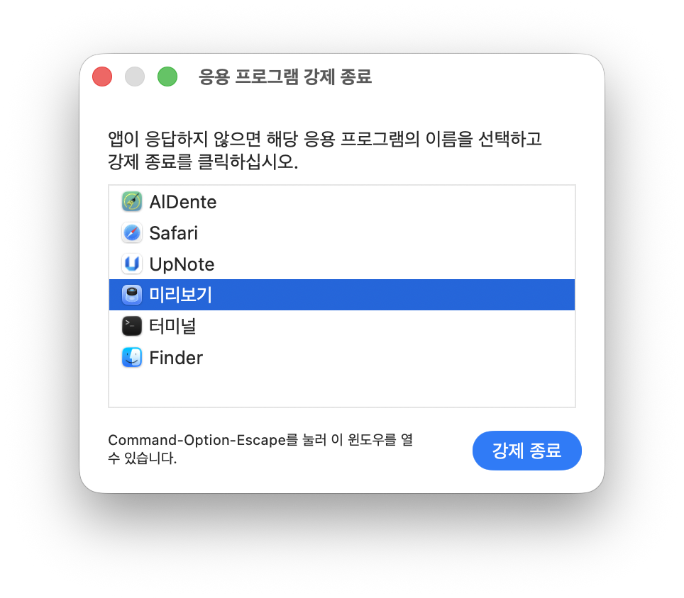 2. 가장 빠르게 해결하기 – 단축키 활용(Option(⌥) + Command(⌘) + Esc)