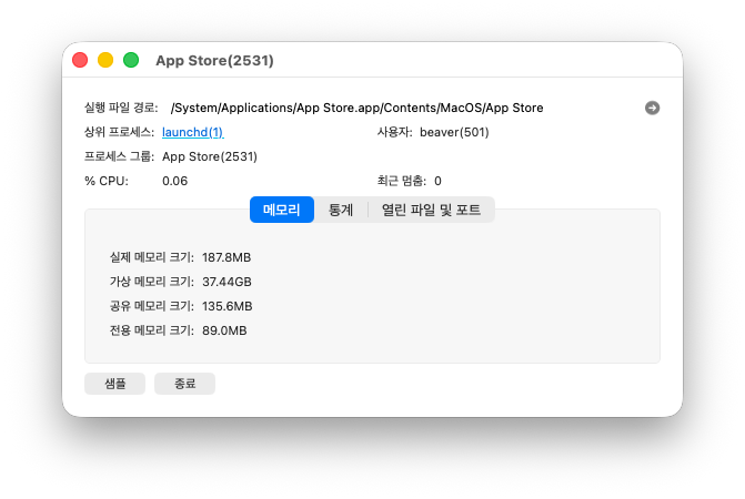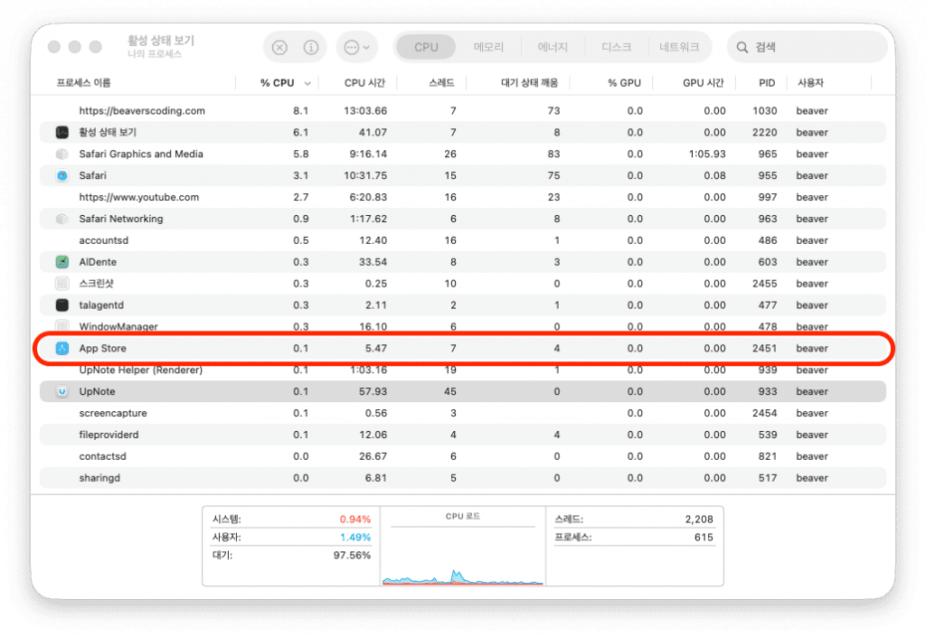 실행된 프로그램들을 쭉 보다보면 강제종료하고자하는 프로그램이 보이실거에요. 저는 예시로 AppStore를 강제종료해야하니 이 부분을 더블클릭하겠습니다.