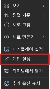 우클릭하시면 위와 같은 메뉴가 나올거에요. 여기서 “개인 설정” 클릭해주세요.