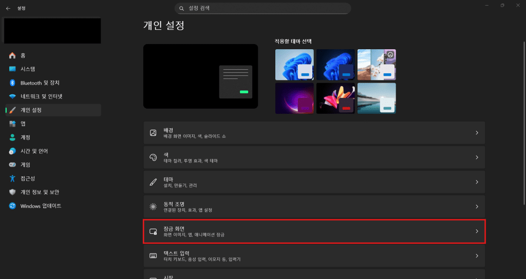 “개인 설정” 클릭하시고나면 위와 같이 “개인 설정” 창이 나오실거에요. 여기서 “잠금 화면” 클릭해주세요.