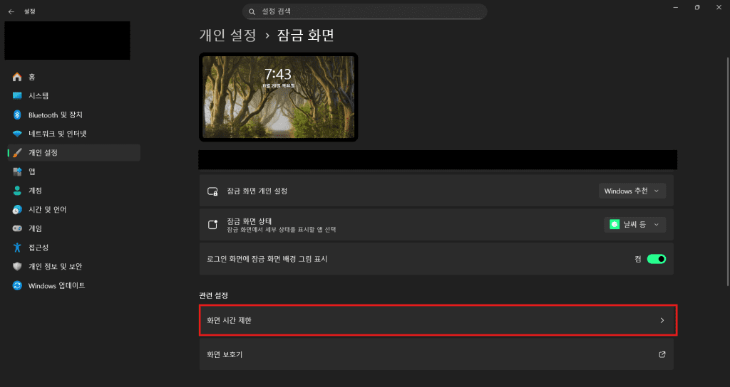 “잠금 화면”클릭하시고 나면 위와 같이 “잠금 화면”에 대한 창이 나올꺼에요. 여기서 “화면 시간 제한”을 클릭해주세요.