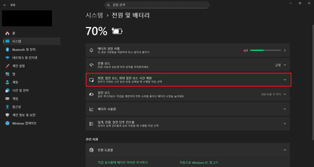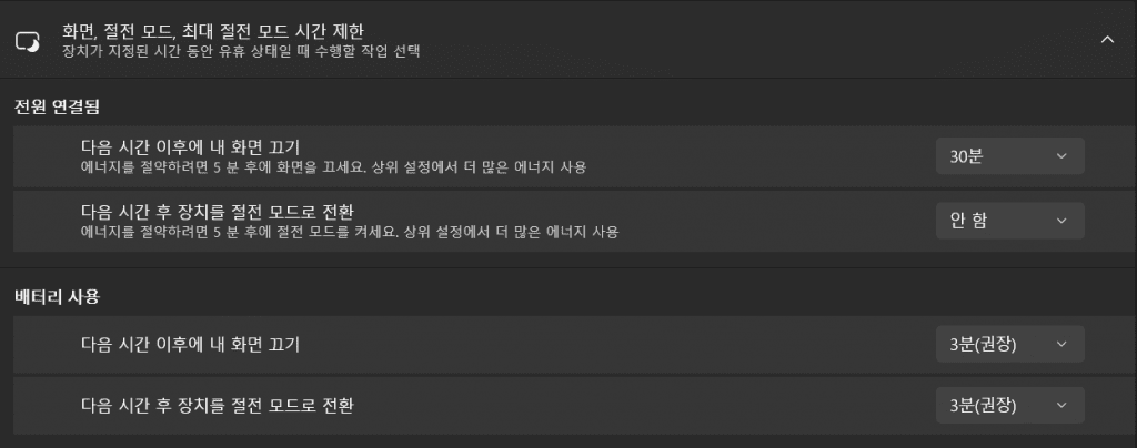 노트북에서는 데스크톱 설정과 달리 “전원 연결됨”과 “배터리 사용” 2가지로 나눠져 있습니다.