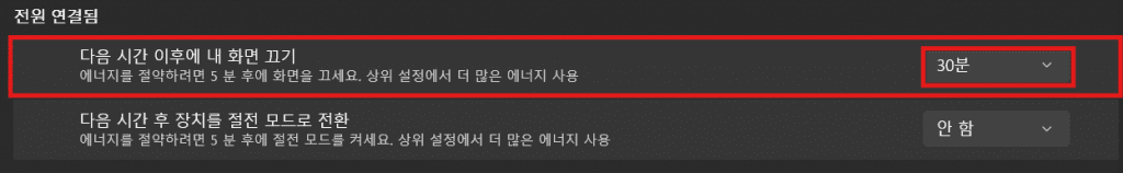 예를들어 노트북 충전케이블 연결된 상태에서 노트북 이용안하는 순간부터 화면꺼지기까지 30분으로 설정하고 싶다면 위와 같이 설정하시면됩니다.
