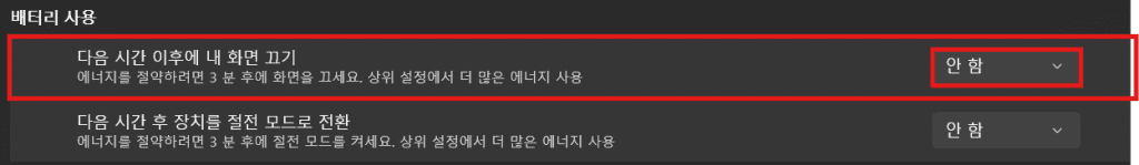 예를들어 노트북 충전 케이블 연결안한 상태에서 노트북 이용안하는 순간부터 계속 화면 켜져있게 하고 싶다면 위와 같이 “안함”으로 설정해주시면 되세요.